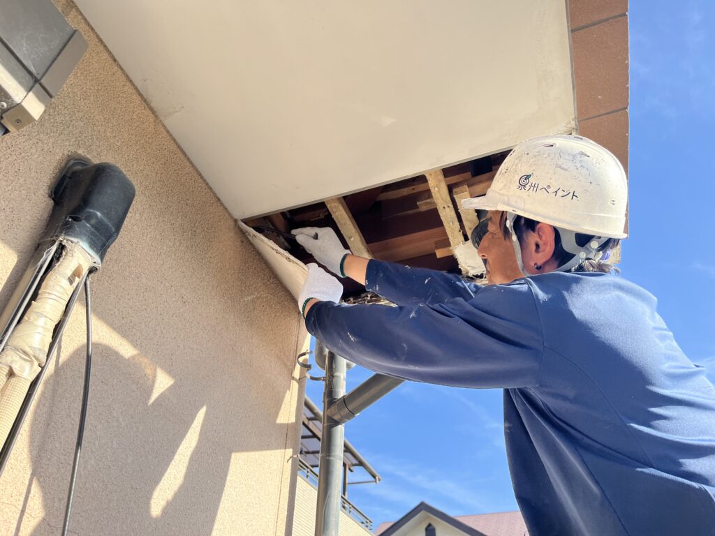 こちらの現場ではベランダ下からの雨漏れでタイルの剥がれ、軒天のめくれが出ていましたので
