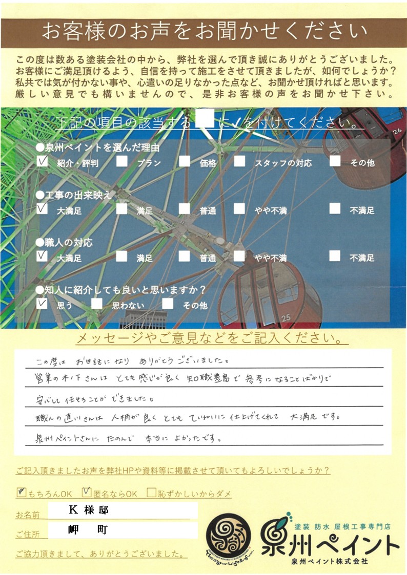 ~ 岬町で外壁塗装工事をされたお客様からの声 ~