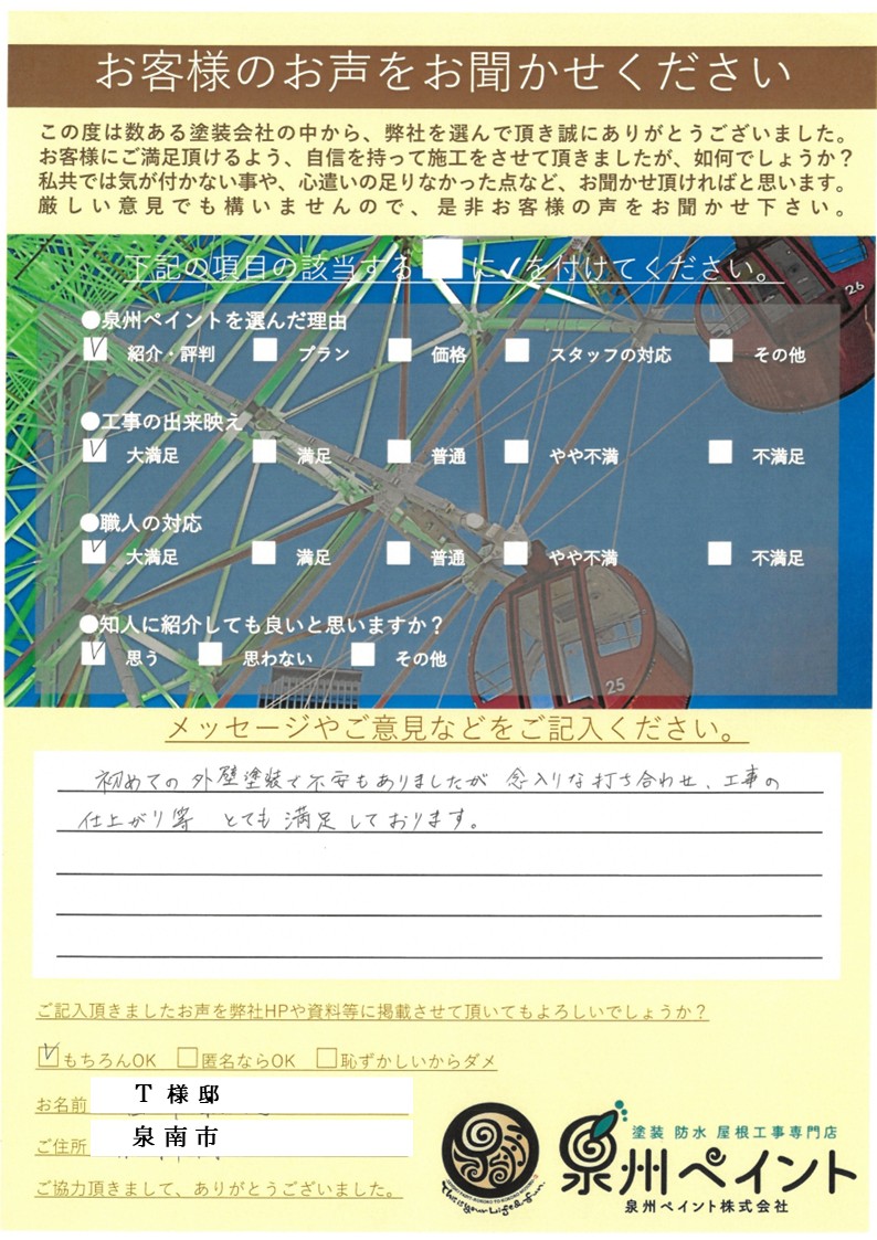 ~ 泉南市で外壁塗装工事をされたお客様からの声 ~