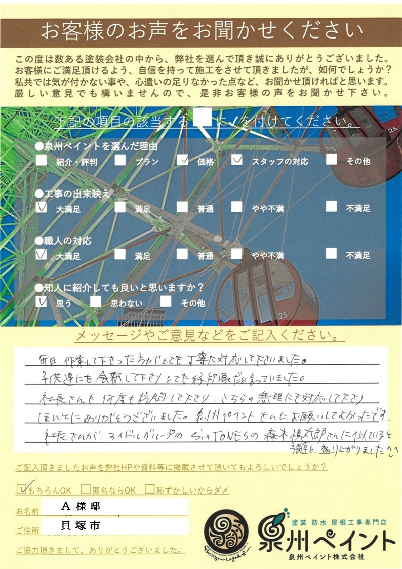 ~ 貝塚市で外壁塗装工事をされたお客様からの声 ~