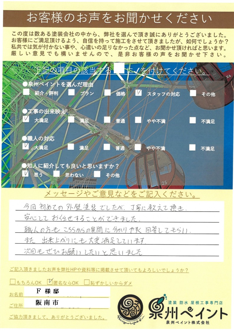 ~ 阪南市で外壁塗装/屋根塗装工事をされたお客様からの声 ~